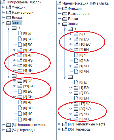 Для исключения зависимости определения ТИМа от знака во всех протоколах были удалены пометки о знаках функций, в результате во всех случаях диагностируемый ТИМ не изменился. Он был определен программой на основании размерностей и витальности/ментальности функции.