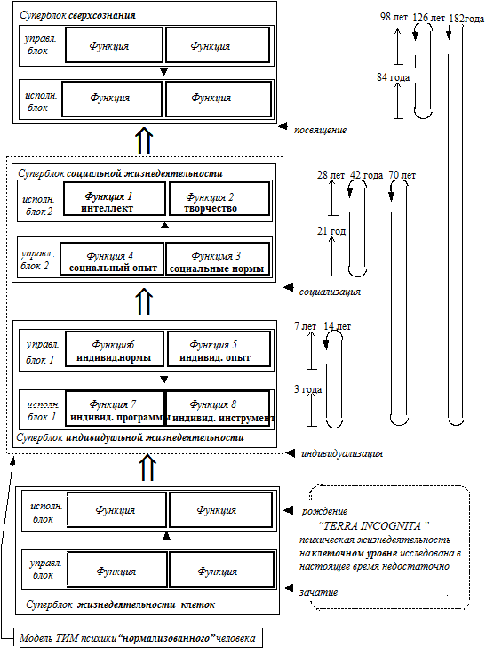 Выше уже отмечалось, что развитие психики определяется системными факторами реализации целевой функции и выражается следующими друг за другом возрастными периодами, сопровождаемыми наполнением информацией психических функций в процессе взаимодействия с окружающим миром. В полной модели ТИМ психики это отображается переходом от суперблока к суперблоку (рис. 1), начиная с клеточного уровня (суперблок Cital) и заканчивая на уровне сверхсознания (суперблок Supermental); в пределах суперблока процессы развития имеют определённые особенности (см. ниже). В случаях затруднения или запрета (блокировки) взаимодействия с окружающим миром той или иной функции или блока, переход к следующему уровню (блоку, суперблоку) всё равно происходит по достижении определённой возрастной границы, а оставшиеся ненаполненными блоки дают о себе знать в дальнейшей жизни человека характерными искажениями ТИМ психики.