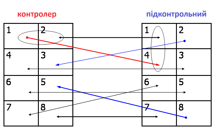 Взаємодія (ревізор ↔ підревізний): 1 ↔ 4, 2 ↔ 1, 3 ↔ 2, 4 ↔ 3, 5 ↔ 8, 6 ↔ 5, 7 ↔ 6, 8 ↔ 7.
