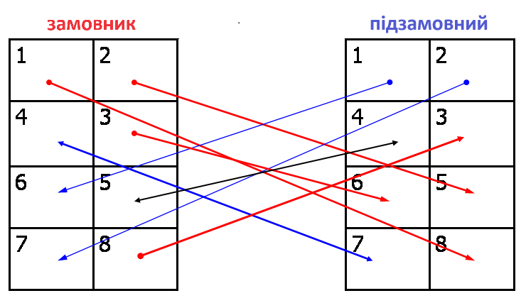 Взаємодія (замовник ↔ підзамовний): 1 ↔ 8, 2 ↔ 5, 3 ↔ 6, 4 ↔ 7, 5 ↔ 4, 6 ↔ 1, 7 ↔ 2, 8 ↔ 3.