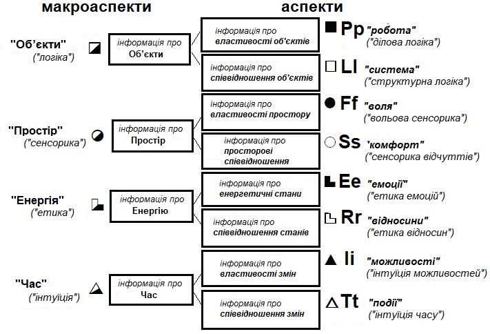 , L — «Система» («структурна логика») — інформаційний аспект, що відображає сприйняття людиною відношень (співвідношень) сутностей об'єктів (інших людей, фізичних та/або віртуальних об'єктів тощо) за окремими параметрами та/або загалом, що із суб'єктивного погляду має сенс сукупного, ієрархічного, структурного, схемного, системного тощо підходів до формування уявлень і діяльності в навколишньому світі.