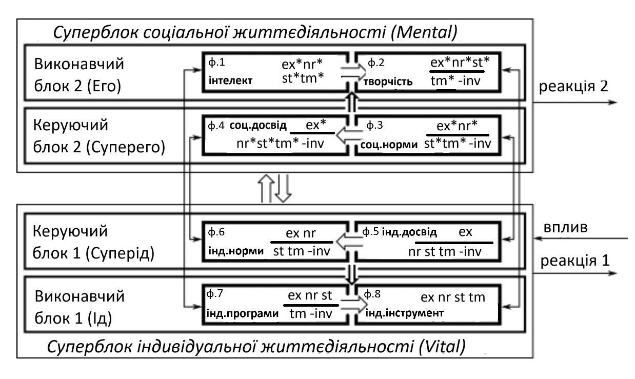 Системний аналіз та апарат інформатики дозволяють досить суворо обґрунтувати параметричну розмірність функцій моделі. Нижче, у структурі моделі психіки наведено розмірності всіх восьми психічних функцій.