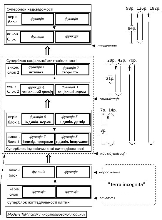 У умовно повної моделі ТИМ психіки періоди (етапи) вікового розвитку психіки людини виглядають так, як показано на малюнку: